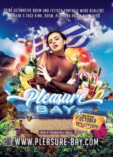 There is loads of great food, there are workshops on bondage, BDSM, etc., there’s a dungeon (of course) and you can stay a few extra days before or after the event and explore Crete if you like. For all the details, including booking, contact details, photos, schedule of events etc, go to https://www.pleasure-bay.com/